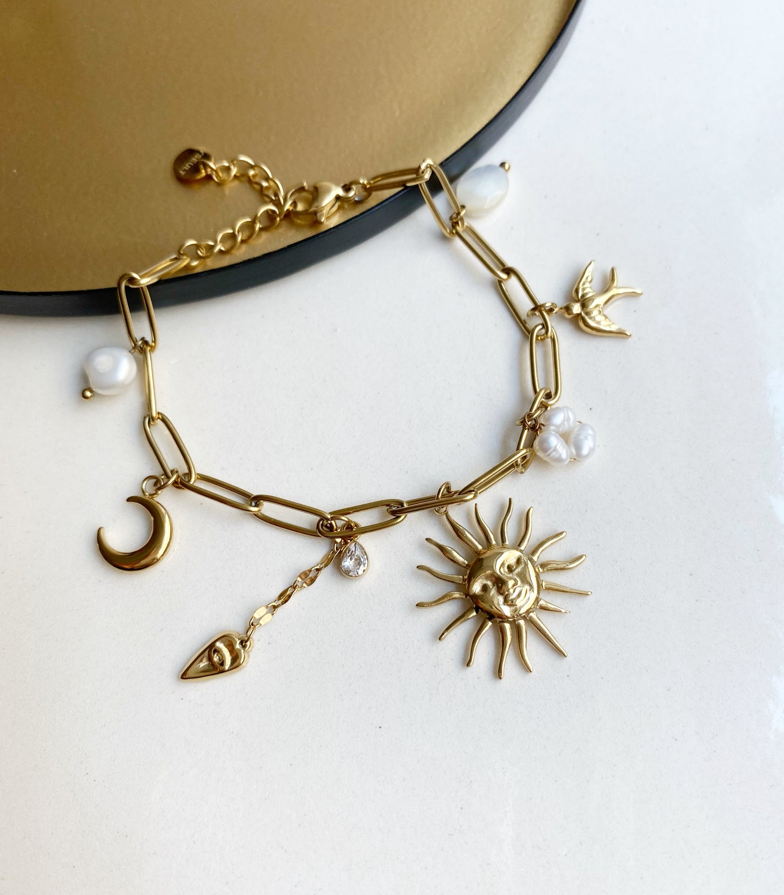 Bracelet en acier doré inoxydable, perles nacrées & charms