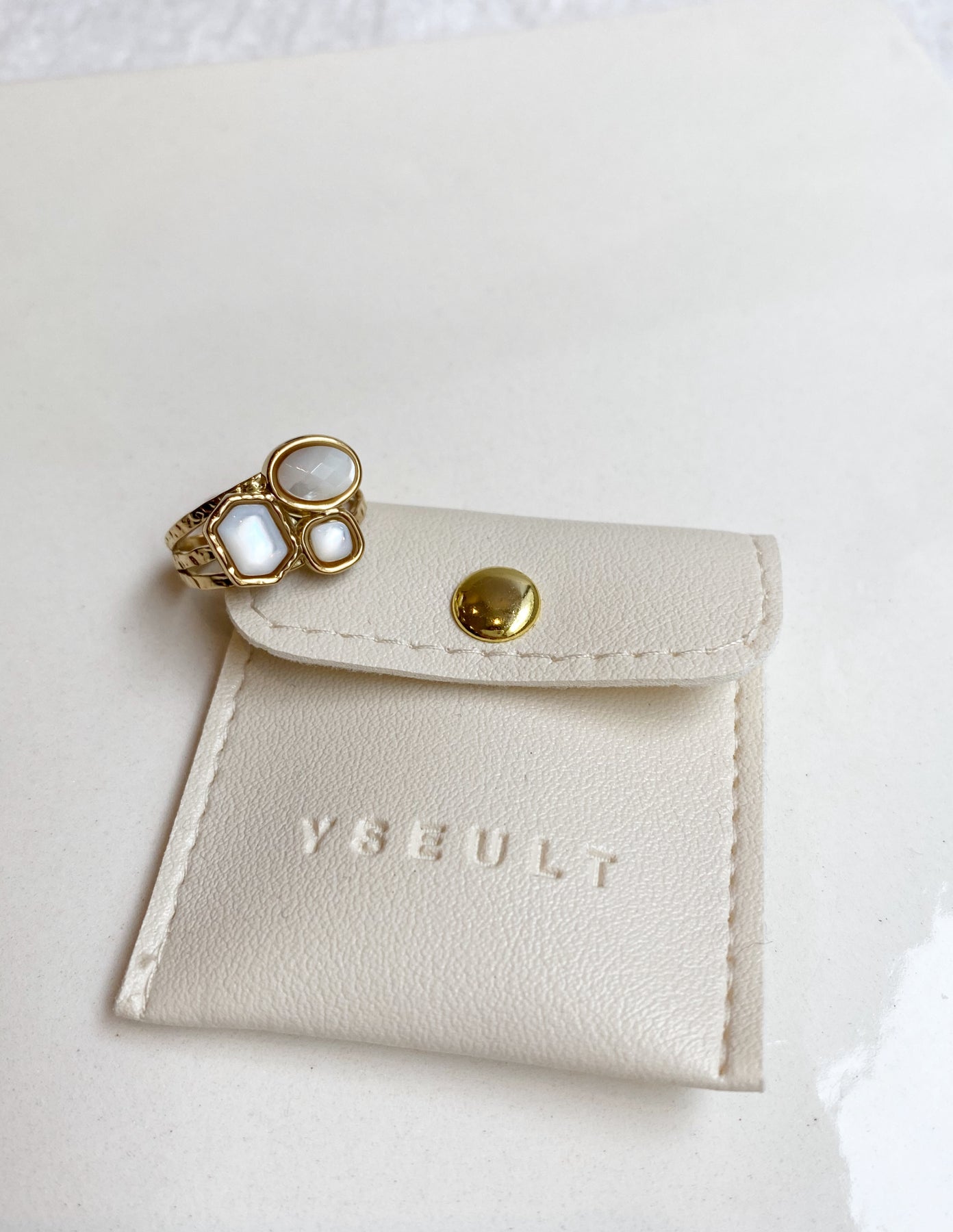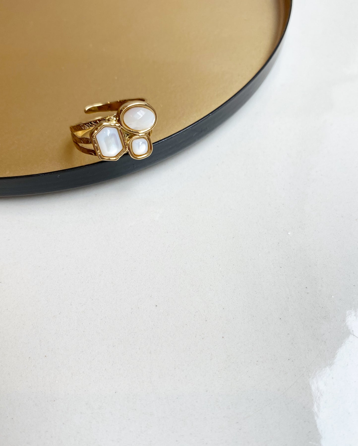Bague en acier doré inoxydable composée de trois nacres de différentes tailles